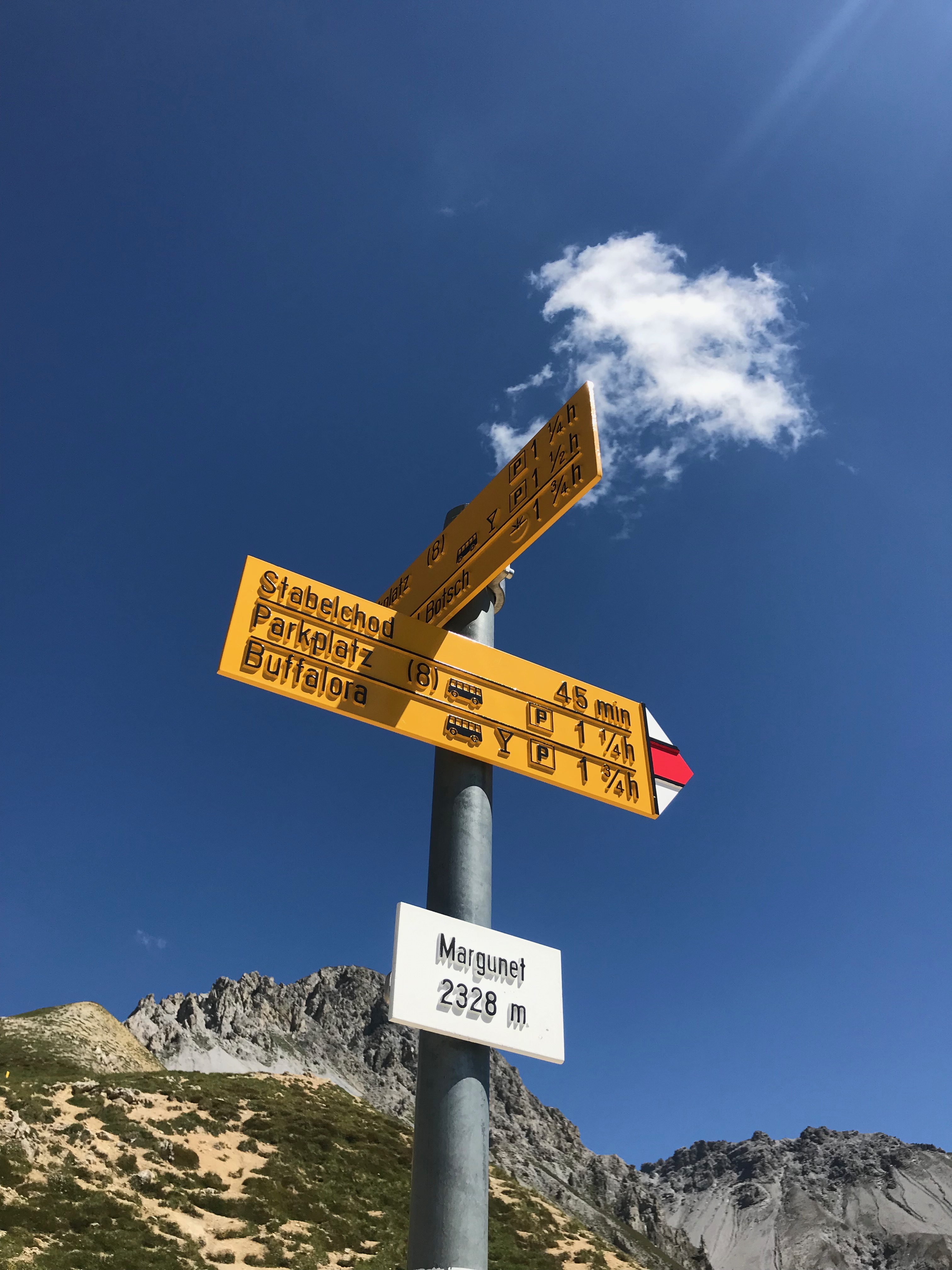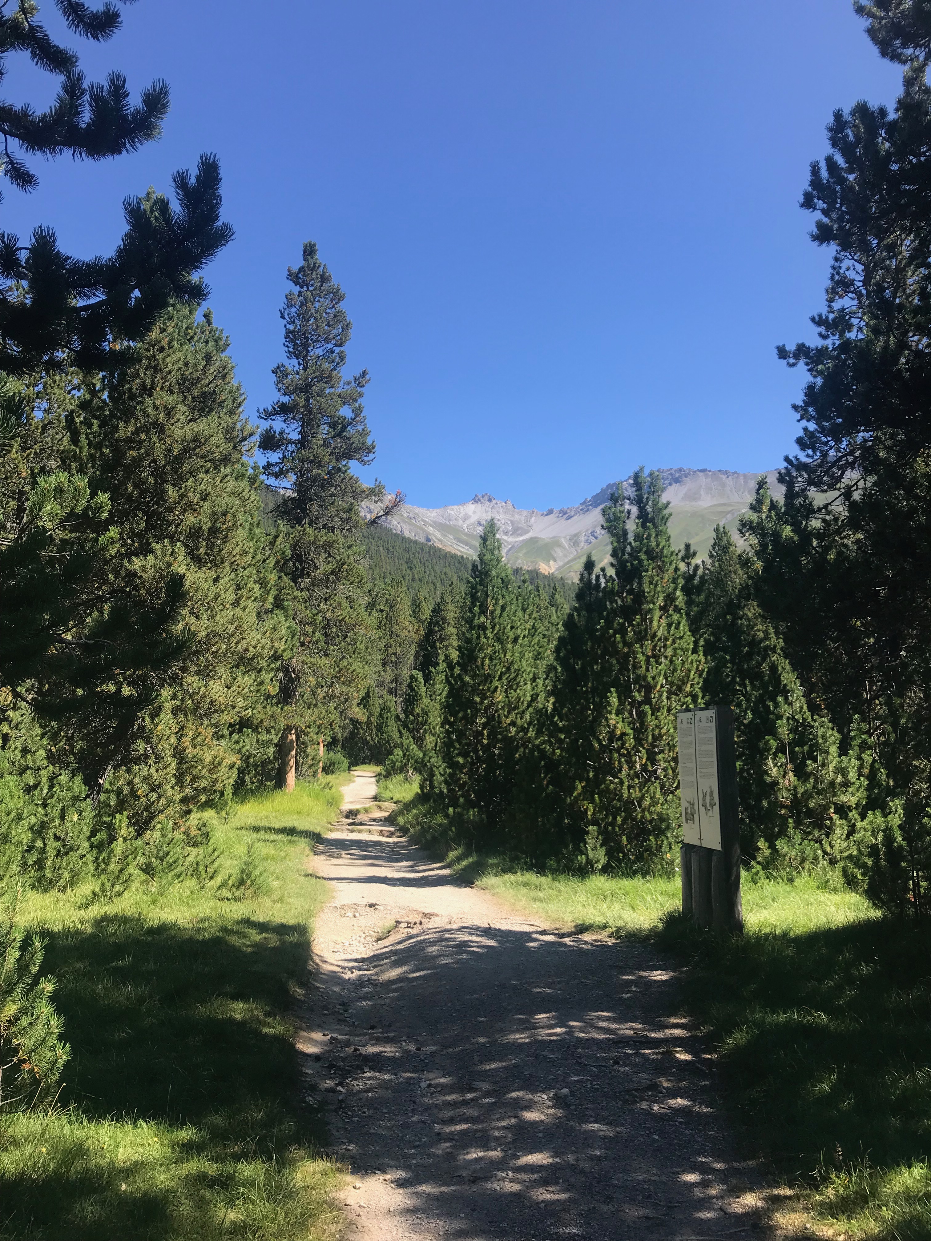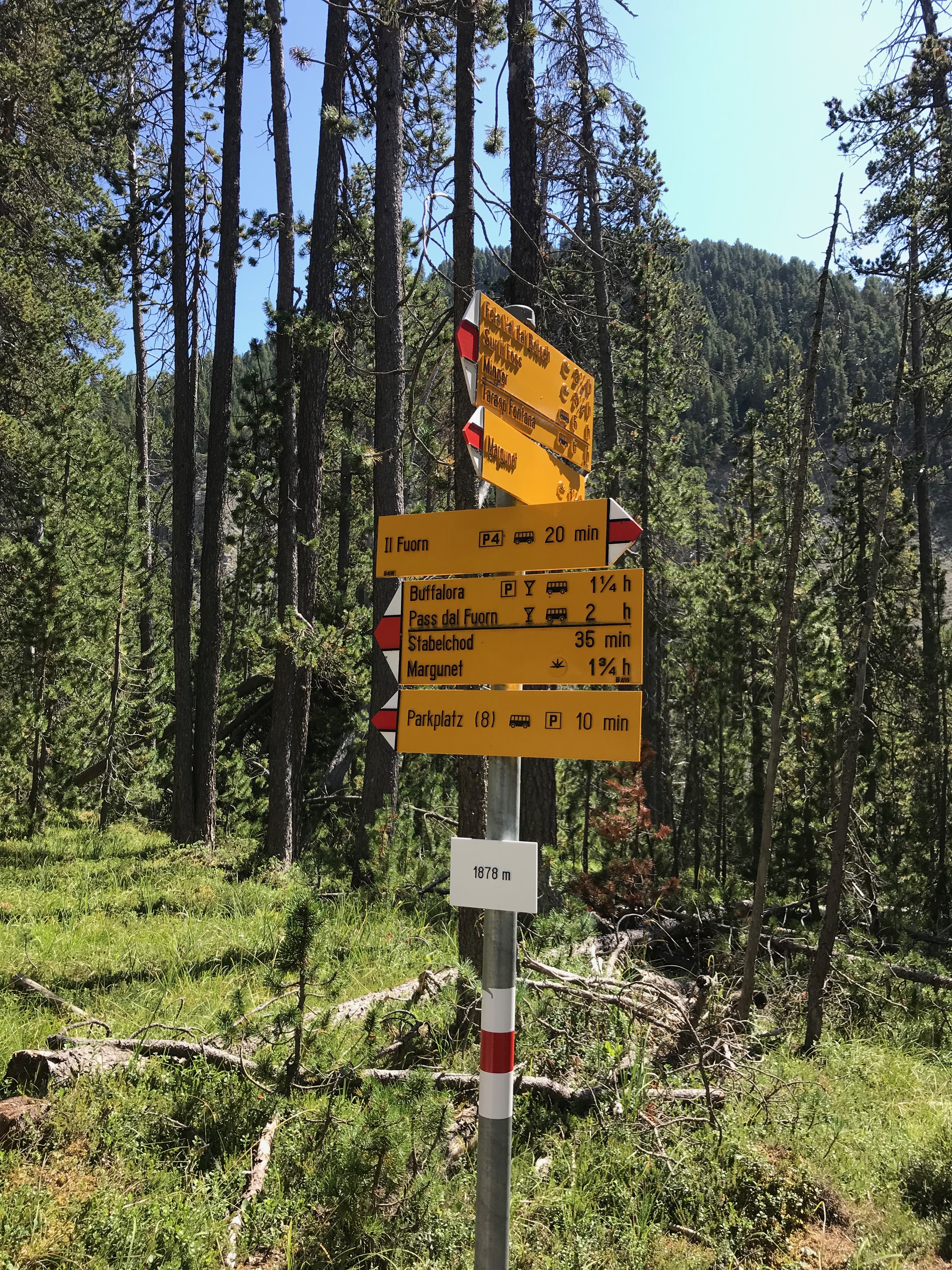 Den Parkplatz P8 erreicht man in etwa 20 Minuten von Zernez aus sowohl mit dem eigenen Auto als auch mit dem Postauto. Die Tafeln am Parkplatz zeigen die Wanderrouten und die Regeln des Nationalparks. Der Weg hoch nach Margunet führt zuerst durch den Wald und an umgestürzten und abgestorbenen Bäumen vorbei. Dies ist typisch für den Nationalpark, da hier die Natur sich selbst überlassen wird.
