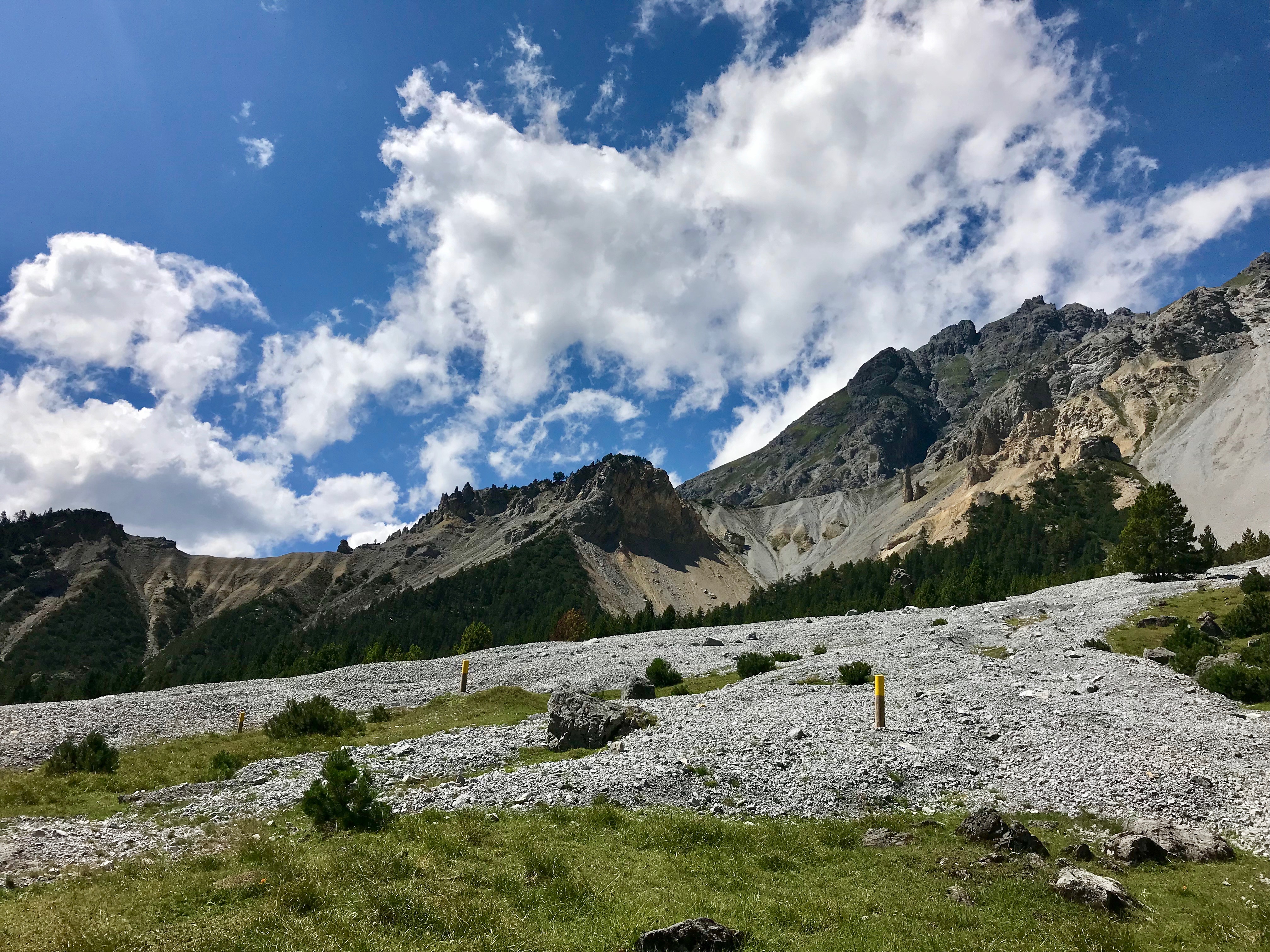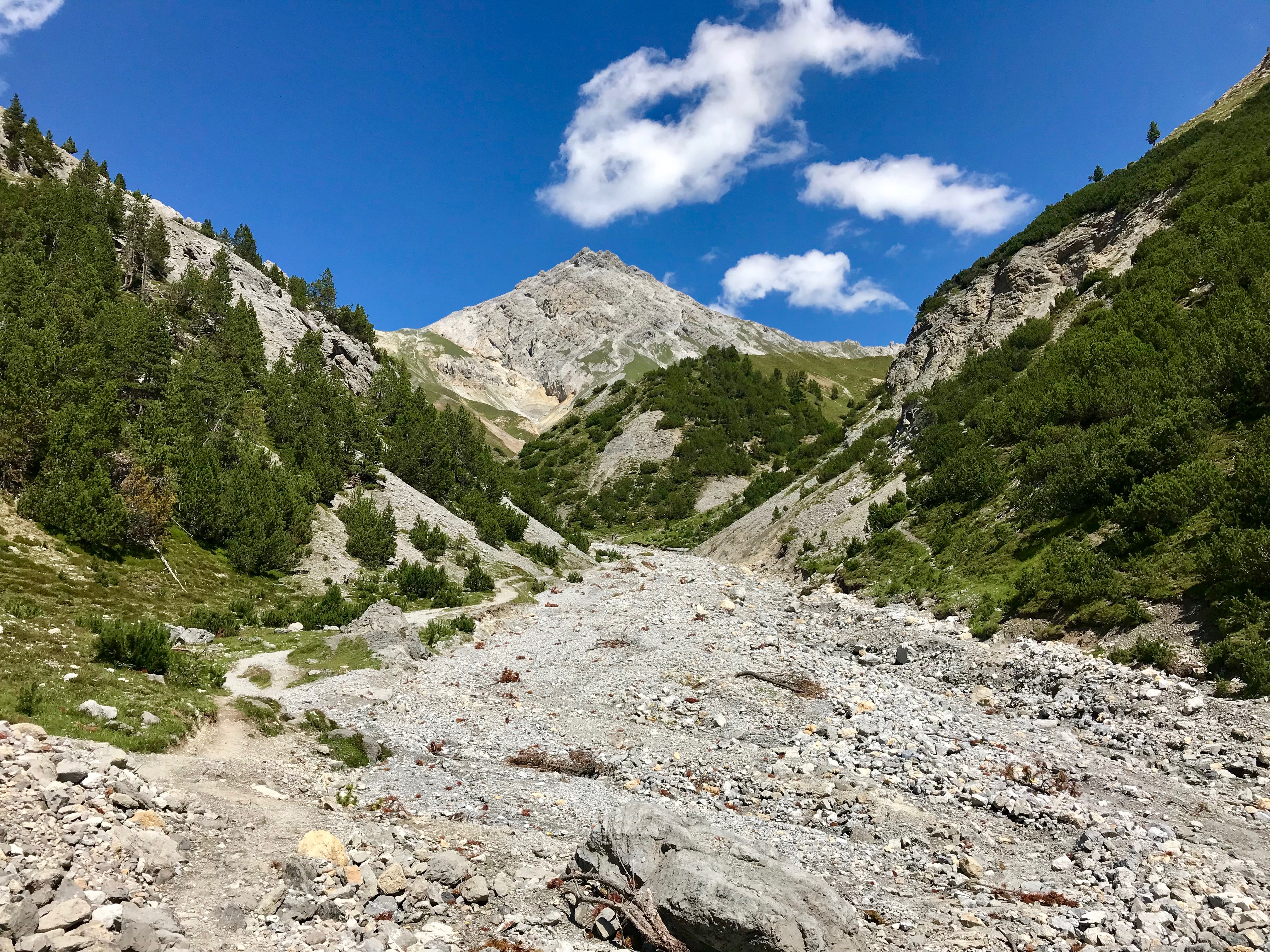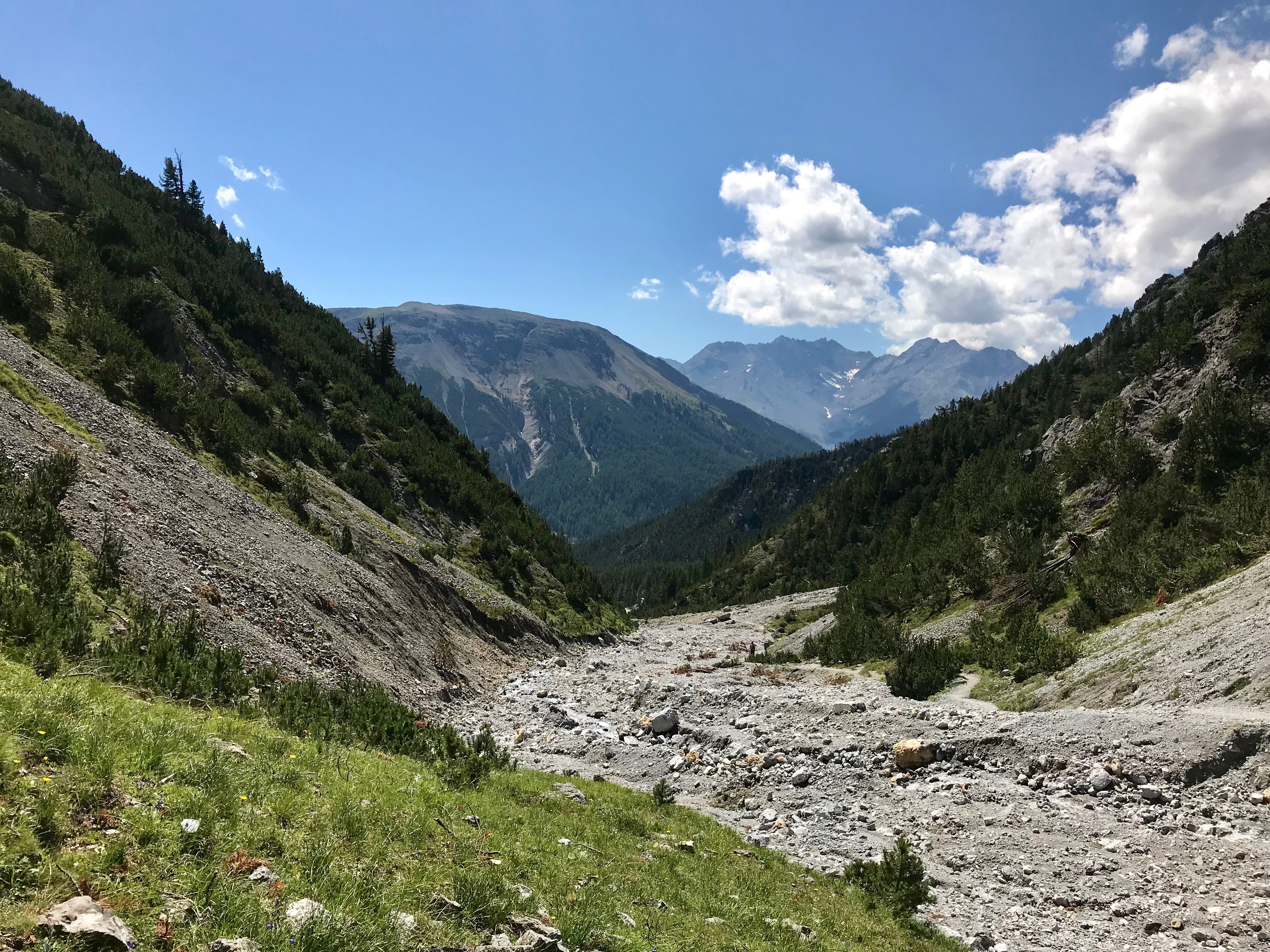 Nun führt der Weg hinunter ins Val dal Botsch und entlang des Baches zurück zur Passstrasse. Dabei kommt man an eindrucksvollen Felsformationen vorbei. An der Passstrasse angelangt, kann man zurück zum Parkplatz P8 wandern, oder weiter nach Il Fuorn, wo sich ebenfalls eine Postautohaltestelle befindet.