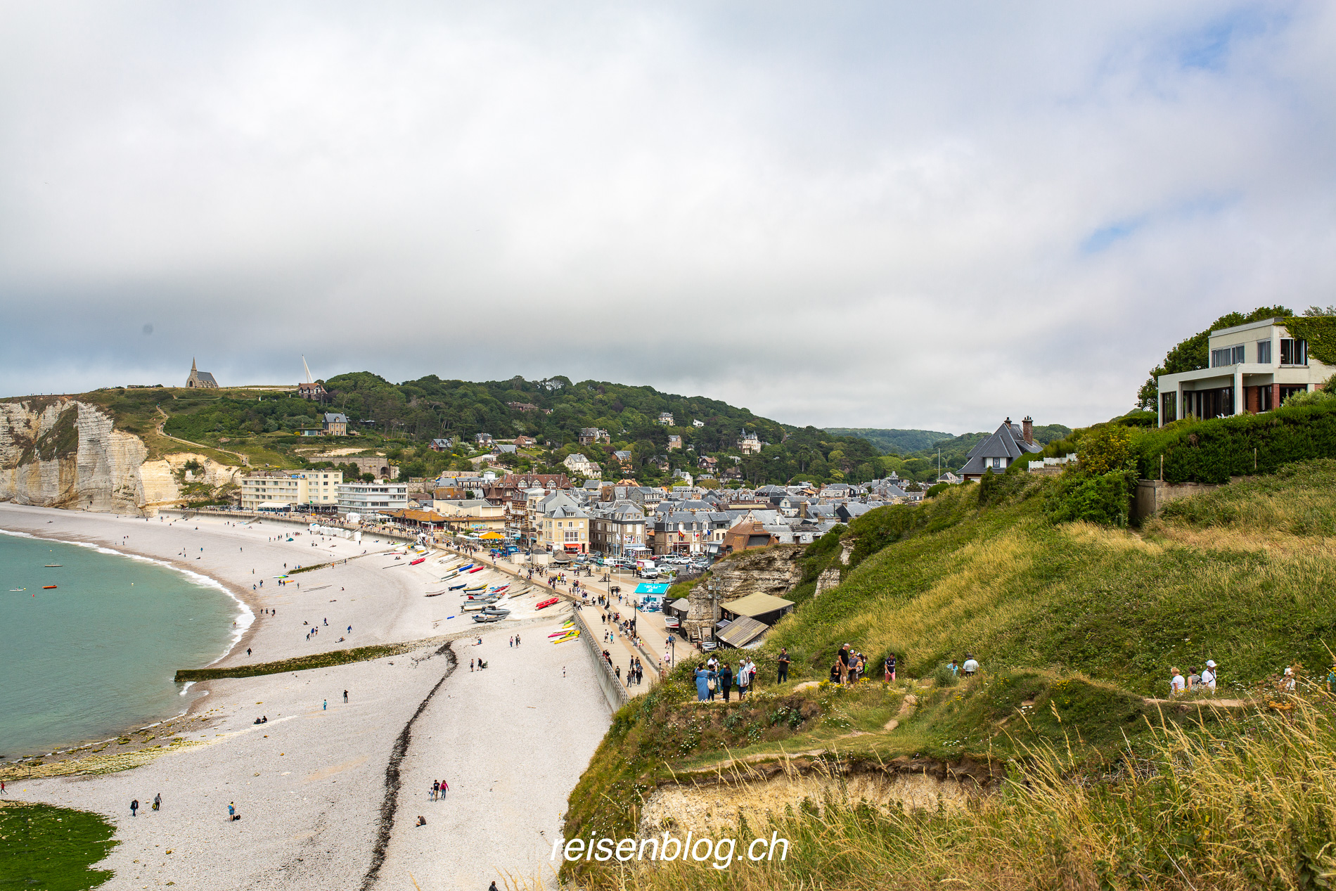 Nach ca. 40 bis 60 Minuten Wanderzeit erreichen wir den Strand von Étretat. Das Dorfzentrum besteht aus einer schmucken und sehr lebhaften Hauptstrasse und ein paar kleinen nicht minder schmucken Nebengässchen.