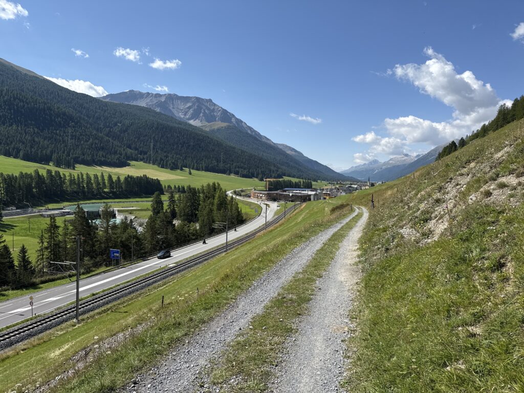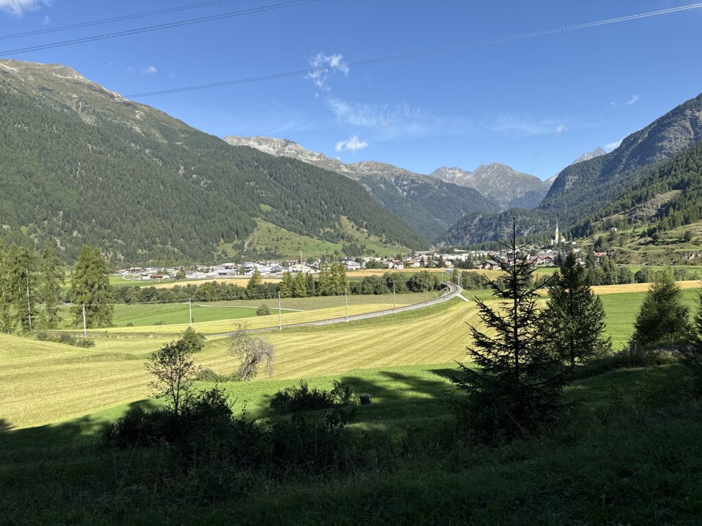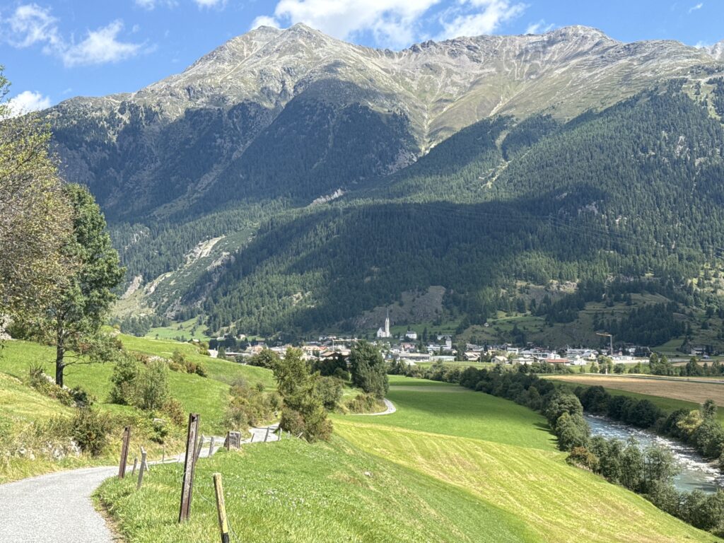 In S-chanf angekommen überquere ich die Dorfstrasse und fahre auf der nun talwärts linken Talseite über Feldwege nach Chapella, Cinuos-chel, Brail und Prazet wieder Zernez entgegen.