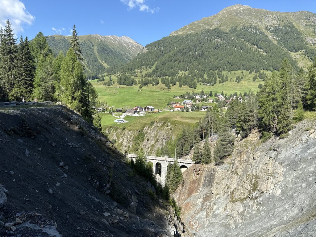 Über die RhB Brücke den Blick auf das kleine Dorf Brail auf der gegenüberliegenden Talseite.